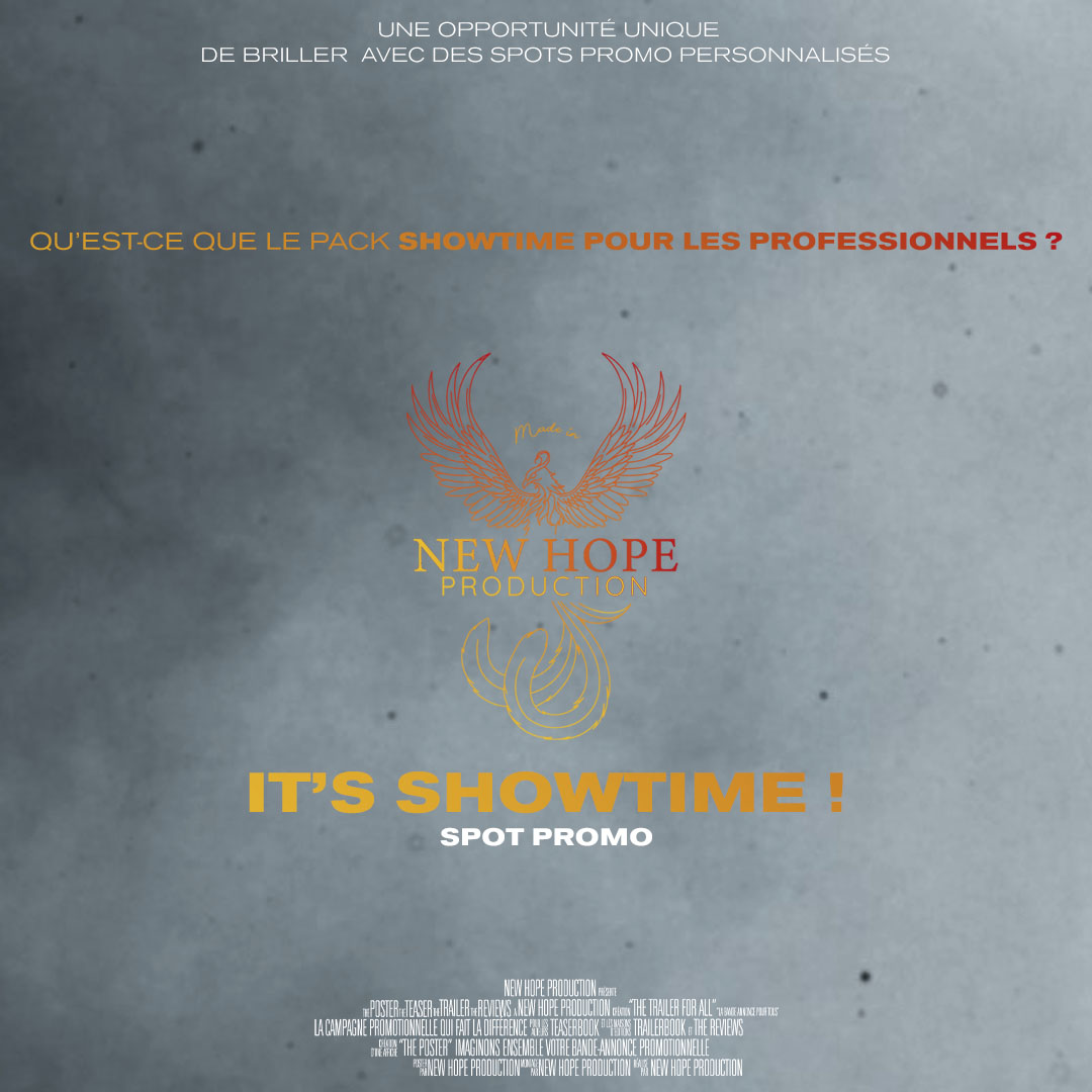 Avec It’s Showtime, New Hope Production  vous propose un spot promo vidéo personnalisé, conçu pour révéler votre univers, votre savoir-faire à travers un format dynamique, professionnel et impactant. It’s Showtime reste dans la continuté des offres « Release The Trailer » et Release The Tourism »